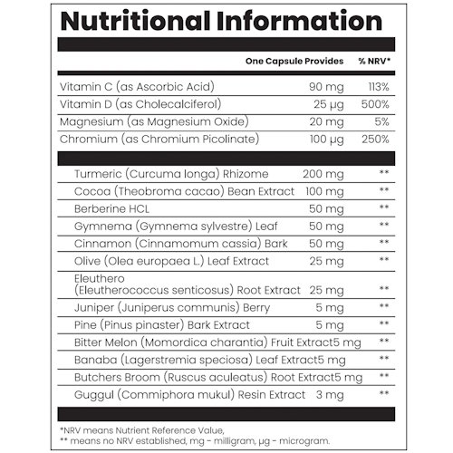Ingredienser: Ifølge produktetiketten pr. kapsel: C-vitamin (som ascorbinsyre) 90 mg, D-vitamin (som cholecalciferol) 25 µg, magnesium (som -oxid) 20 mg, krom (som krompicolinat) 100 µg. Planteekstrakter og pulver: Gurkemeje-rhizom 200 mg, kakaobønneekstrakt 100 mg, berberin-HCl 50 mg, gymnema-blad 50 mg, kanelbark 50 mg, olivenbladekstrakt 25 mg, eleuthero-rod 25 mg, enebær 5 mg, fyrrebarkekstrakt 5 mg, bitter melonfrugt 5 mg, banaba-bladekstrakt 5 mg, hestekastanje-rod 3 mg, guggul-harpiks 3 mg.