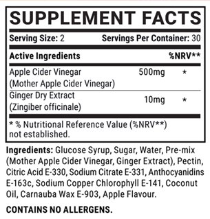 Æbleeddike leverer eddikesyre – i studier diskuteres blandt andet et bidrag til mæthed og ernæringsbevidsthed; resultaterne er heterogene og skal ikke forstås som en helbredende påstand. Ingefærekstrakt er traditionelt kendt for sine kulinariske og velværegivende egenskaber; forskningsarbejder undersøger blandt andet termogenese og subjektiv sultfølelse. Gummierne indeholder ikke gelatine, er lette at indtage og kan nemt integreres i dagligdagen. (Ingredienser ifølge producentens hjemmeside.)