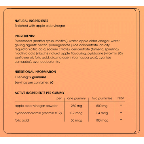Hver daglig dosis (2 tyggegummier) indeholder ifølge produktoplysningerne: Æblecidereddike pulver 500 mg, vitamin B12 (cyanocobalamin) 1,4 µg og folinsyre (folat) 100 µg. Yderligere ingredienser: Sødestoffer (maltitsirup, maltitol), vand, æblecidereddike, geleringsmiddel pektin, granatæblejuicekoncentrat, surhedsregulatorer (citronsyre, natriumcitrat), farve- og plantekoncentrater (kurkuma, spirulina), nikotinsyre (niacin), naturlig æblearoma, pyridoxin (vitamin B6), solsikkeolie, overtræksmiddel (carnaubavoks). Opskriften er således baseret på et frugtagtigt tyggetabletformat med pektin.