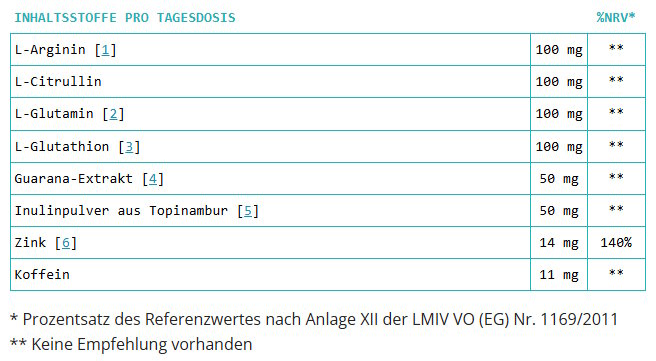 Teralin indeholder pr. daglig dosis: L-arginin (100 mg), L-citrullin (100 mg), L-glutamin (100 mg), L-glutathion (100 mg), guaranaekstrakt (50 mg), inulin fra jordskok (50 mg), zink (som citrat, 14 mg; 140 % NRV) samt koffein (11 mg). L-arginin og L-citrullin er kendt som forstadier til nitrogenmonoxid og forbindes ofte med blodcirkulation og præstationsvilje. L-glutamin og L-glutathion understøtter cellulære processer, mens zink blandt andet bidrager til et normalt stofskifte af kulhydrater, fedtsyrer og makronæringsstoffer. Inulin fungerer som præbiotisk fiber, mens guarana og koffein giver milde aktiveringsimpulser. Sammensætningen er rettet mod daglig brug: kapsler en gang dagligt, klart doseret, uden komplicerede protokoller. (Kilde: Shop-ingrediensside)